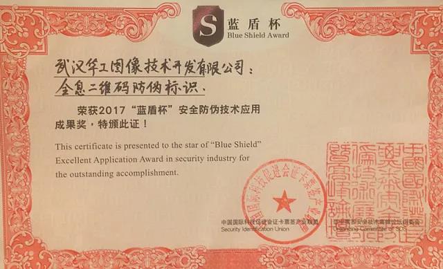 榮獲2017“藍(lán)盾杯”安全防偽技術(shù)應(yīng)用成果獎。